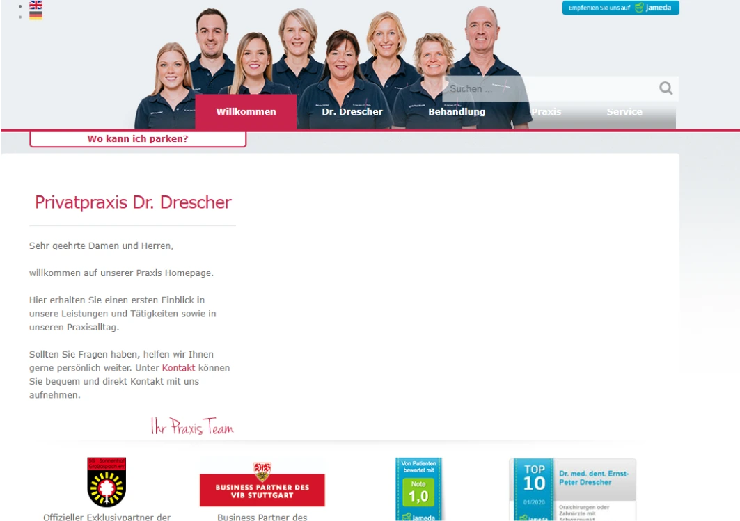 Die Zahnarztpraxis Dr. Drescher in Stuttgart bietet hochwertige zahnmedizinische Leistungen in einem modernen und patientenorientierten Umfeld. Für eine klare Kommunikation des breiten Behandlungsspektrums und zur Gewinnung neuer Patienten benötigte die Praxis eine professionelle, einladende Online-Präsenz. Nach Jahren mit einer veralteten Website wandte sich das Team an uns, um eine moderne, benutzerfreundliche und SEO-optimierte Lösung zu realisieren.