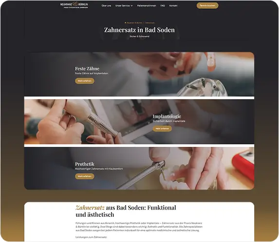 Neukranz & Bürklin steht für moderne Zahnmedizin, persönliche Betreuung und ein breites Behandlungsspektrum. Der neue mobiloptimierte Webauftritt stärkt Sichtbarkeit, Vertrauen und die gezielte Ansprache neuer Patienten.